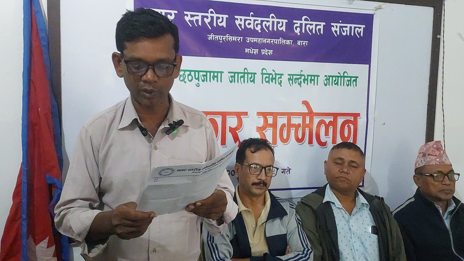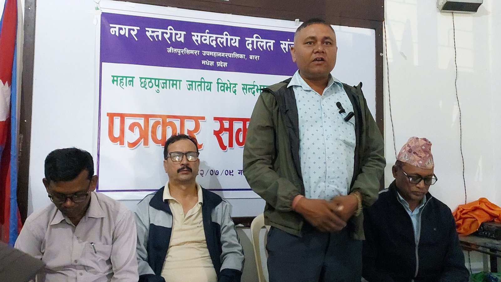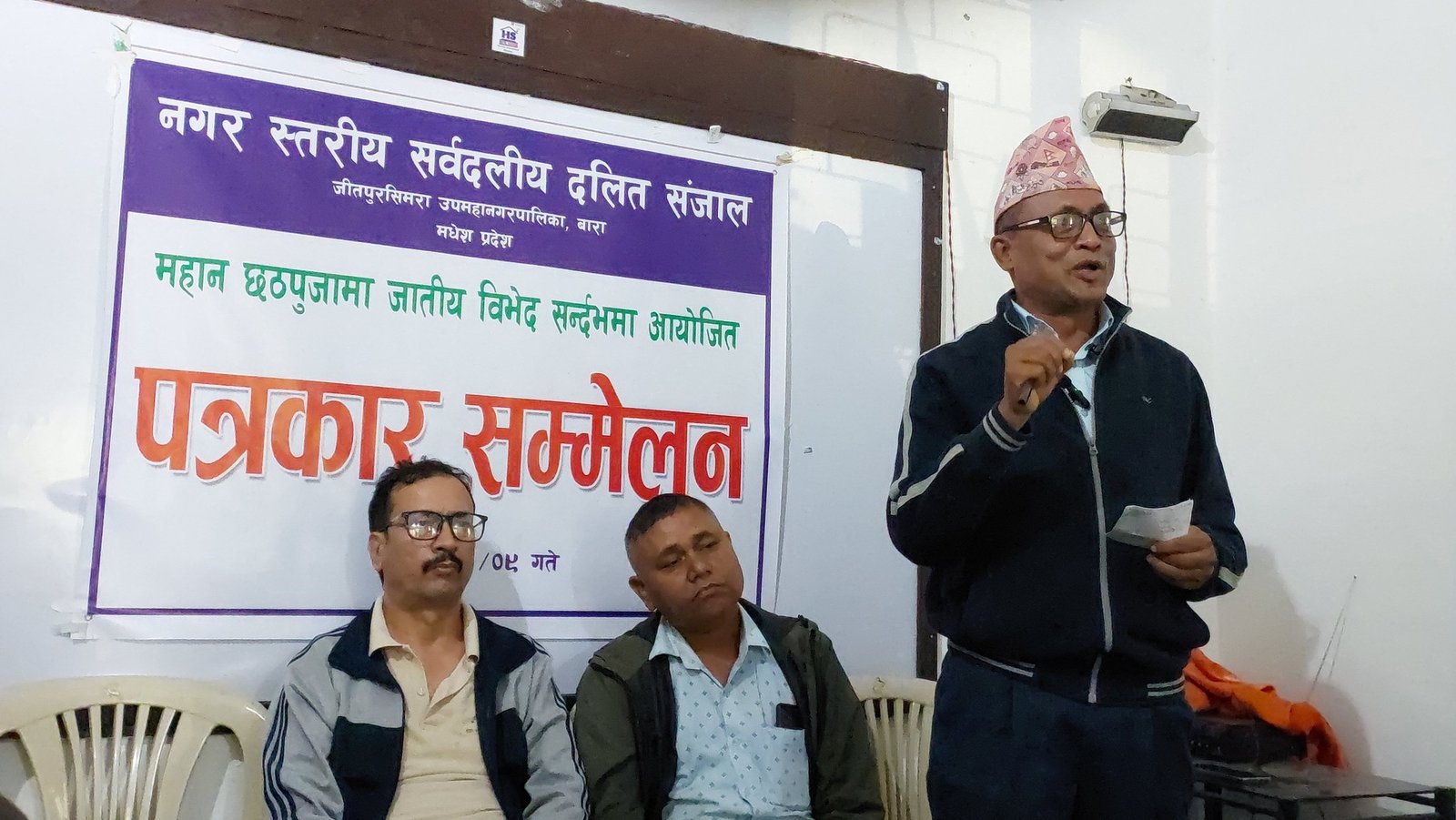 तराईबासीहरूको महान पर्व छठमा दलित समुदायमाथि जातीय विभेद गरिएको भन्दै जितपुरसिमरा उपमहानगर स्तरीय सर्वदलीय दलित सञ्जालले सिमरामा पत्रकार सम्मेलन गर्दै कडा आपत्ति जनाएको छ।