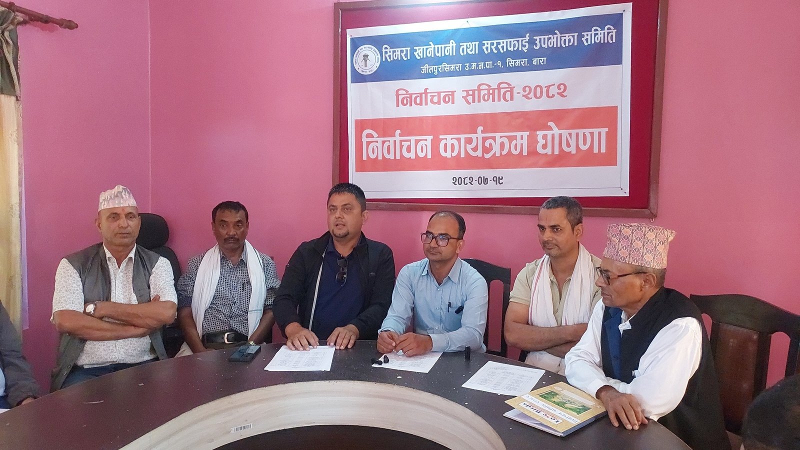 बाराको सिमरा स्थित सिमरा खानेपानी उपभोक्ता तथा सरसफाइ समितिको नयाँ कार्यसमिति चयनका लागि निर्वाचन मिति तय गरिएको छ। बुधबार दिउँसो सिमरा खानेपानी कार्यालयमा पत्रकार सम्मेलन गर्दै निर्वाचन समितिले आगामी मंसिर ६ गते मतदान हुने गरी सम्पूर्ण तालिका सार्वजनिक गरेको हो।निर्वाचन कार्यक्रमअनुसार कार्तिक २० गतेदेखि निर्वाचन प्रक्रिया औपचारिक रूपमा सुरु हुनेछ।
