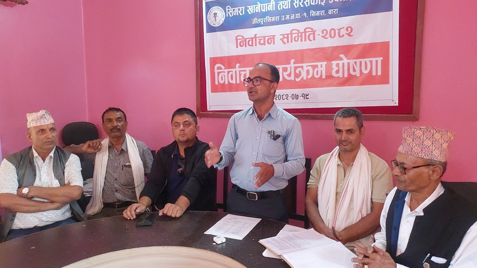 बाराको सिमरा स्थित सिमरा खानेपानी उपभोक्ता तथा सरसफाइ समितिको नयाँ कार्यसमिति चयनका लागि निर्वाचन मिति तय गरिएको छ। बुधबार दिउँसो सिमरा खानेपानी कार्यालयमा पत्रकार सम्मेलन गर्दै निर्वाचन समितिले आगामी मंसिर ६ गते मतदान हुने गरी सम्पूर्ण तालिका सार्वजनिक गरेको हो।निर्वाचन कार्यक्रमअनुसार कार्तिक २० गतेदेखि निर्वाचन प्रक्रिया औपचारिक रूपमा सुरु हुनेछ।
