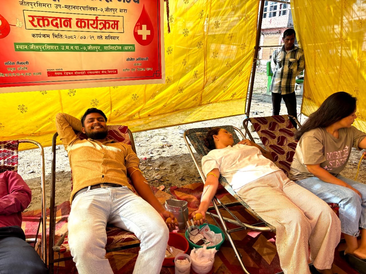 “मानवताको सेवा नै जीवनको सर्वोत्तम कार्य हो” भन्ने प्रेरणादायी नारासहित बाराको जितपुरमा आयोजित रक्तदान कार्यक्रम उत्साहपूर्ण र सफलतापूर्वक सम्पन्न भएको छ। शान्ति युवा विकास मञ्च जीतपुरको आयोजनामा जितपुरस्थित शान्तिटोल खेल मैदानमा भएको कार्यक्रममा स्थानीय युवादेखि समाजसेवी, व्यापारी तथा विभिन्न संघ–संस्थाका प्रतिनिधिहरूको उल्लेखनीय सहभागिता रहेको थियो। मञ्चका अध्यक्ष योगेश अधिकारीका अनुसार सामाजिक उत्तरदायित्वप्रति युवा पुस्ताको सक्रियता प्रशंसनीय देखिएको छ।