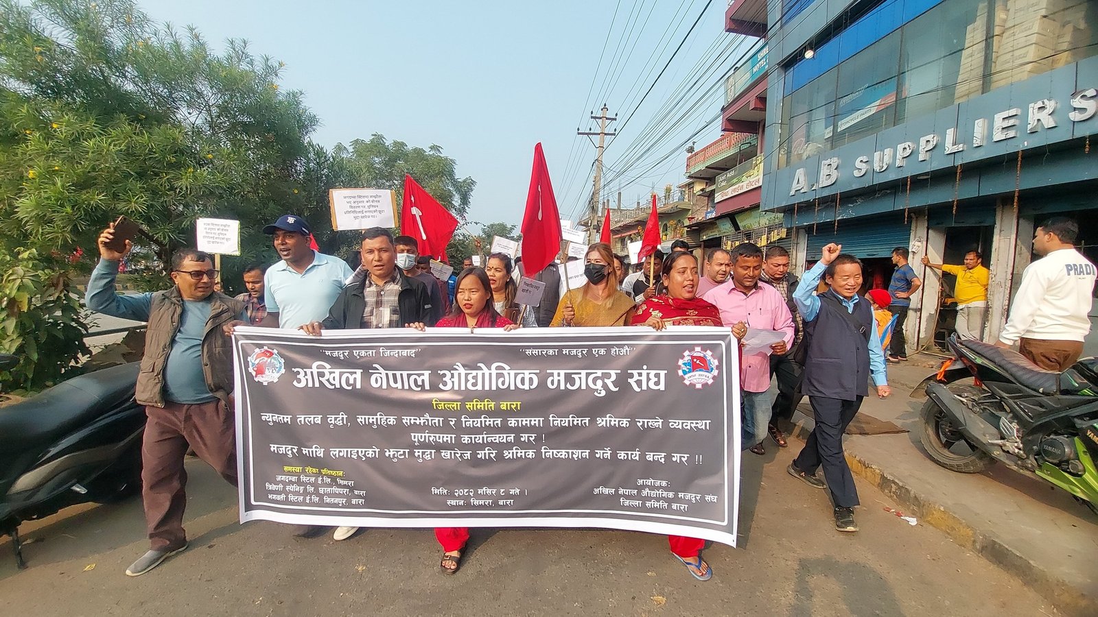 बारा–पर्सा औद्योगिक करिडोरका मजदुरहरूले श्रम कानुनअनुसार तोकिएका सेवा–सुविधा कार्यान्वयन गर्न माग गर्दै सोमवार स्थानीय प्रशासनलाई ध्यानाकर्षण पत्र बुझाएका छन्। अखिल नेपाल औद्योगिक मजदुर संघको नेतृत्वमा सिमरास्थित जगदम्बा स्टिल, भगवती स्टिल र त्रिवेणी स्पिनिङ मिल छातापिपरामा कार्यरत मजदुरहरूले ईलाका प्रहरी कार्यालय सिमरा र ईलाका प्रशासन कार्यालय सिमरामा ¥यालीसहित प्रशासन कार्यालय पुगेर आफ्नो मागहरू औपचारिक रूपमा राखेका हुन्।