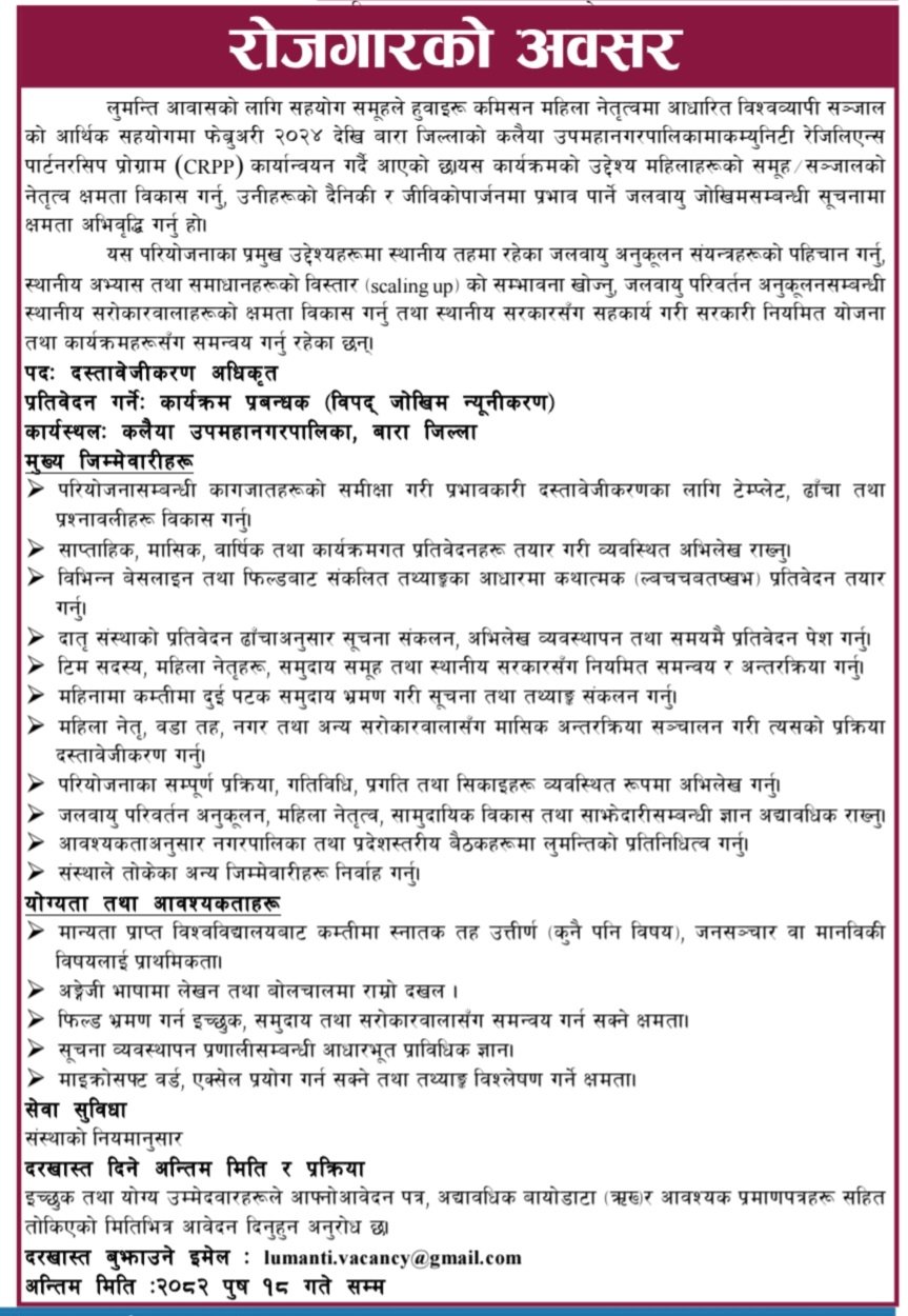 सेवा सुविधा संस्थाको नियमानुसार उपलब्ध गराइनेछ। इच्छुक तथा योग्य उम्मेदवारहरूले आवेदन पत्र, अद्यावधिक बायोडाटा (CV) र आवश्यक प्रमाणपत्रहरू सहित २०८२ पुष १८ गतेसम्म इमेल lumanti.vacancy@gmail.com मार्फत दरखास्त दिन सक्नेछन्।
