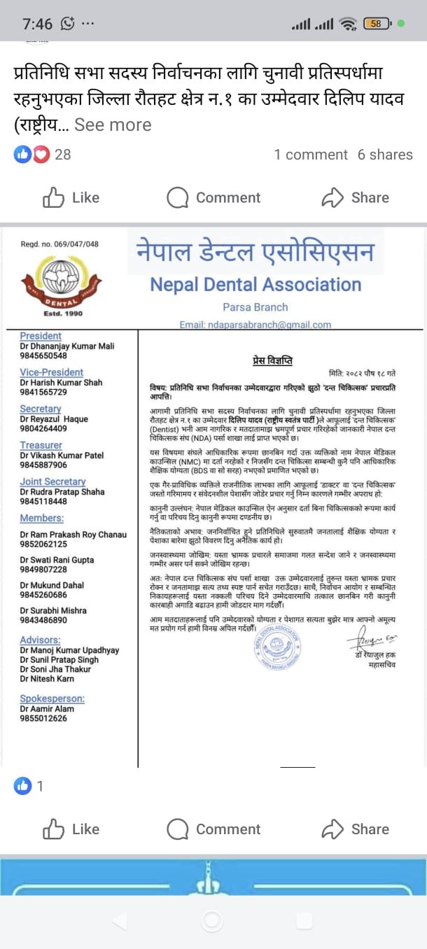सचिव महत्तोको हस्ताक्षरमा जारी विज्ञप्तिमा मिति २०८२ साल पौष १८ गते प्रकाशित एनडिए पर्सा शाखाको विज्ञप्तिले प्रतिनिधि सभा निर्वाचनका उम्मेदवार एनडिएचए का केन्द्रीय संयाेजक तथा उपाध्यक्ष दिलिप कुमार यादव (राष्ट्रिय स्वतन्त्र पार्टी) लाई लक्षित गरी डेन्टिस्ट नभएको, दन्त स्वास्थ्यसम्बन्धी आवश्यक शैक्षिक योग्यता र आधिकारिकता नभएको भनी गरिएको प्रचारप्रति कडा आपत्ति जनाइएको छ ।विज्ञप्तिमा उल्लेख गरिएअनुसार दिलिप कुमार यादव पेशागत रूपमा डेन्टल हाइजिनिष्ट हुन् र उनी नेपाल सरकारको प्रचलित ऐन, नियम तथा मापदण्डअनुसार विधिवत् दर्ता भई लामो समयदेखि दन्त स्वास्थ्य सेवामा क्रियाशील रहँदै आएका छन् । उनी वीरगञ्जस्थित उज्ज्वल डेन्टल केयर एण्ड अर्थोडोन्टिक सेन्टर मार्फत सेवा प्रदान गर्दै आएको तथा नेपाल स्वास्थ्य व्यवसायी परिषदबाट लाइसेन्स प्राप्त आधिकारिक स्वास्थ्यकर्मी रहेको एनडिएचए ले स्पष्ट पारेको छ ।