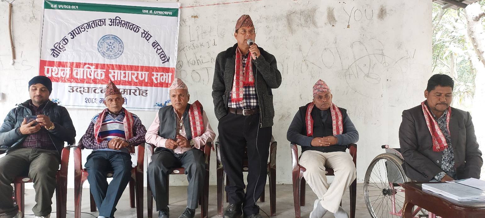 जीतपुरसिमरा–४ औराहामा बौद्धिक अपाङ्गता अभिभावक संघ बाराको प्रथम अधिवेशन सम्पन्न भएको छ। अधिवेशनले संघको औपचारिक संरचना सुदृढ गर्दै आगामी कार्यदिशा तय गर्ने उद्देश्य राखेको आयोजकले जनाएको छ।कार्यक्रमका प्रमुख अतिथि जीतपुरसिमरा उपमहानगरपालिकाका उप–प्रमुख भोला प्रसाद अधिकारीले बौद्धिक अपाङ्गता सहित सम्पूर्ण प्रकारका अपाङ्गता भएका व्यक्तिप्रति उपमहानगरपालिका गम्भीर रहेको बताउनुभयो। उहाँले नगरपालिकाले आफ्ना स्रोत–साधनले भ्याएसम्म अपाङ्गता भएका व्यक्तिहरू र उनीहरूका अभिभावकलाई आवश्यक सहयोग गर्न तयार रहेको उल्लेख गर्नुभयो। कतिपय विषयहरू व्यक्तिगत चाहनाले मात्र सम्भव नहुने भए पनि तिनको कार्यान्वयनका लागि निरन्तर प्रयास भइरहेको उहाँको भनाइ थियो।