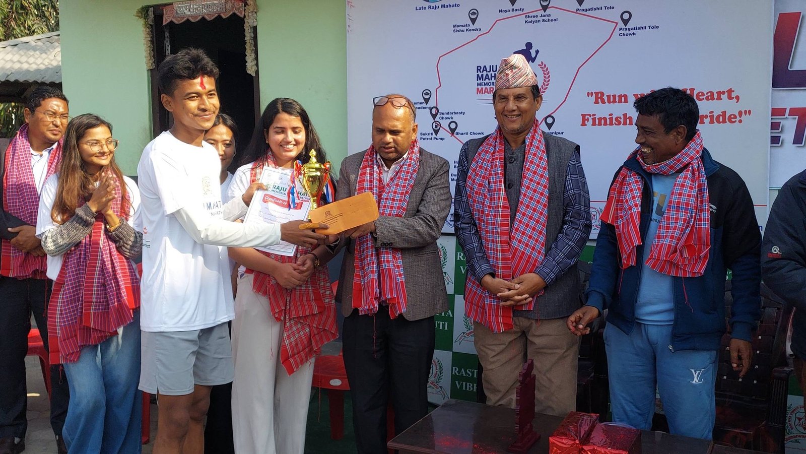 त्यस्तै छात्रातर्फ औसका चौधरी प्रथम, सन्जाना चौधरी द्वितीय तथा करुना चौधरी तृतीय हुन सफल भए।दौड सम्पन्न भएपछि आयोजित पुरस्कार वितरण समारोहमा विजेताहरूलाई नगदसहित सम्मान गरिएको थियो। प्रथम हुनेलाई पाँच हजार रुपैयाँ, द्वितीयलाई तीन हजार रुपैयाँ र तृतीय हुनेलाई दुई हजार रुपैयाँ नगद पुरस्कार प्रदान गरिएको आयोजकले जनाएको छ।विद्यालय व्यवस्थापन समितिका अध्यक्ष विदुर कुमार खड्काको अध्यक्षतामा सम्पन्न कार्यक्रममा स्वर्गीय राजु महतोका अभिभावक रामावतार महतो र कमलीदेवी महतो विशेष अतिथिका रूपमा उपस्थित थिए।कार्यक्रमका प्रमुख अतिथि जीतपुरसिमरा उपमहानगरपालिकाका नगर उपप्रमुख भोला प्रसाद अधिकारीले विजयी खेलाडीहरूलाई पुरस्कार वितरण गर्दै युवापुस्तालाई खेलकुदतर्फ आकर्षित गर्न यस्ता प्रतियोगिताहरूले महत्वपूर्ण भूमिका खेल्ने बताए।