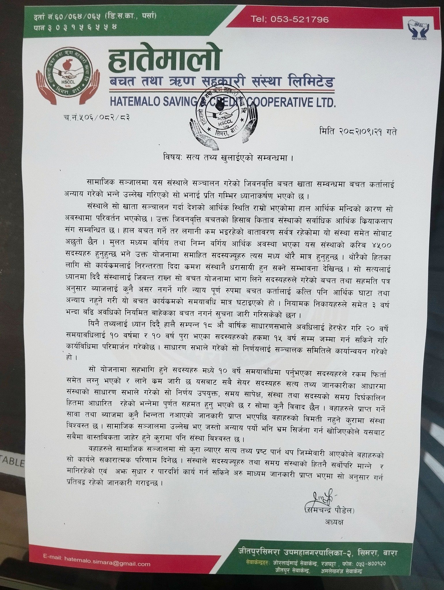 हातेमालो बचत तथा ऋण सहकारीद्वारा सार्वजनिक भ्रमबारे स्पष्टिकरण