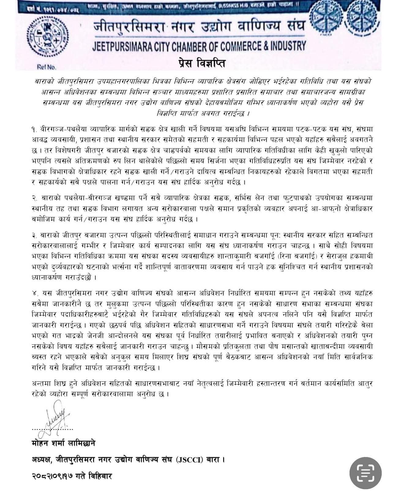जितपुरसिमरा उद्योग वाणिज्य संघद्वारा सडक अतिक्रमण र व्यवसायीमाथिको दुव्र्यवहारप्रति आपत्ति